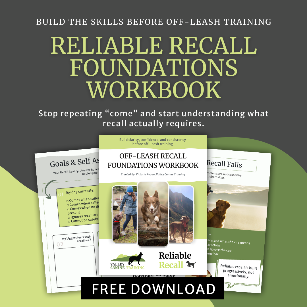 Off-leash recall doesn’t fail because dogs are stubborn — it fails when the foundation is unclear. This free workbook helps you understand what must be in place before off-leash training, so you stop guessing, repeating cues, and rushing progress. Learn why recall breaks down, how motivation and distance affect reliability, and how to know when your dog is truly ready for calm, confident off-leash freedom.